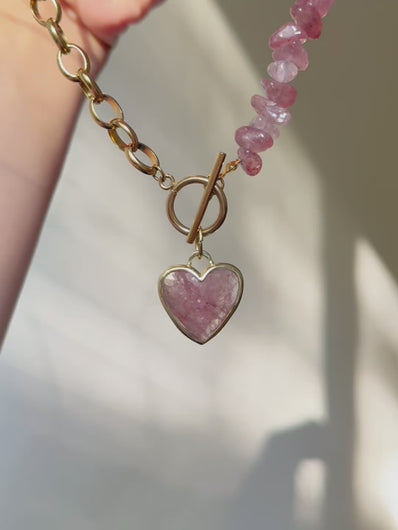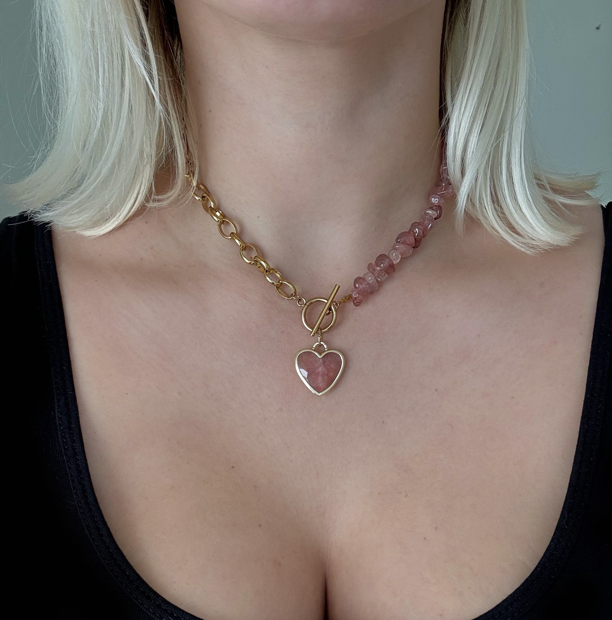 Colgante en forma de corazon: Cuarzo fresa y latón chapado en oro 18k